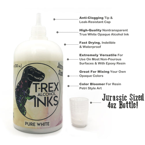 Our T-Rex Pure White Ink is truly Jurassic sized!! And you don't need to buy special applicators to use it because it has the same anti-clogging tip and easy-screw top as our regular bottles. This large size is perfect for ink artists with a wide array of projects from beautiful paintings to resin ink drop Petri artworks or wherever your artistic sails take you. Use it to mix your own custom opaque colors for a whole new prism of palettes in your arsenal. The bottle is ergonomically shaped and hard to knock over with a wide sturdy base much like a T-Rex!